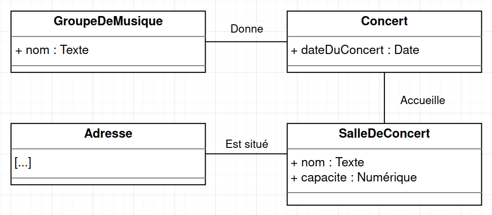 Voici un diagramme de classes représentant des concerts donnés par des groupes de musique. Déterminez les multiplicités possibles des associations :