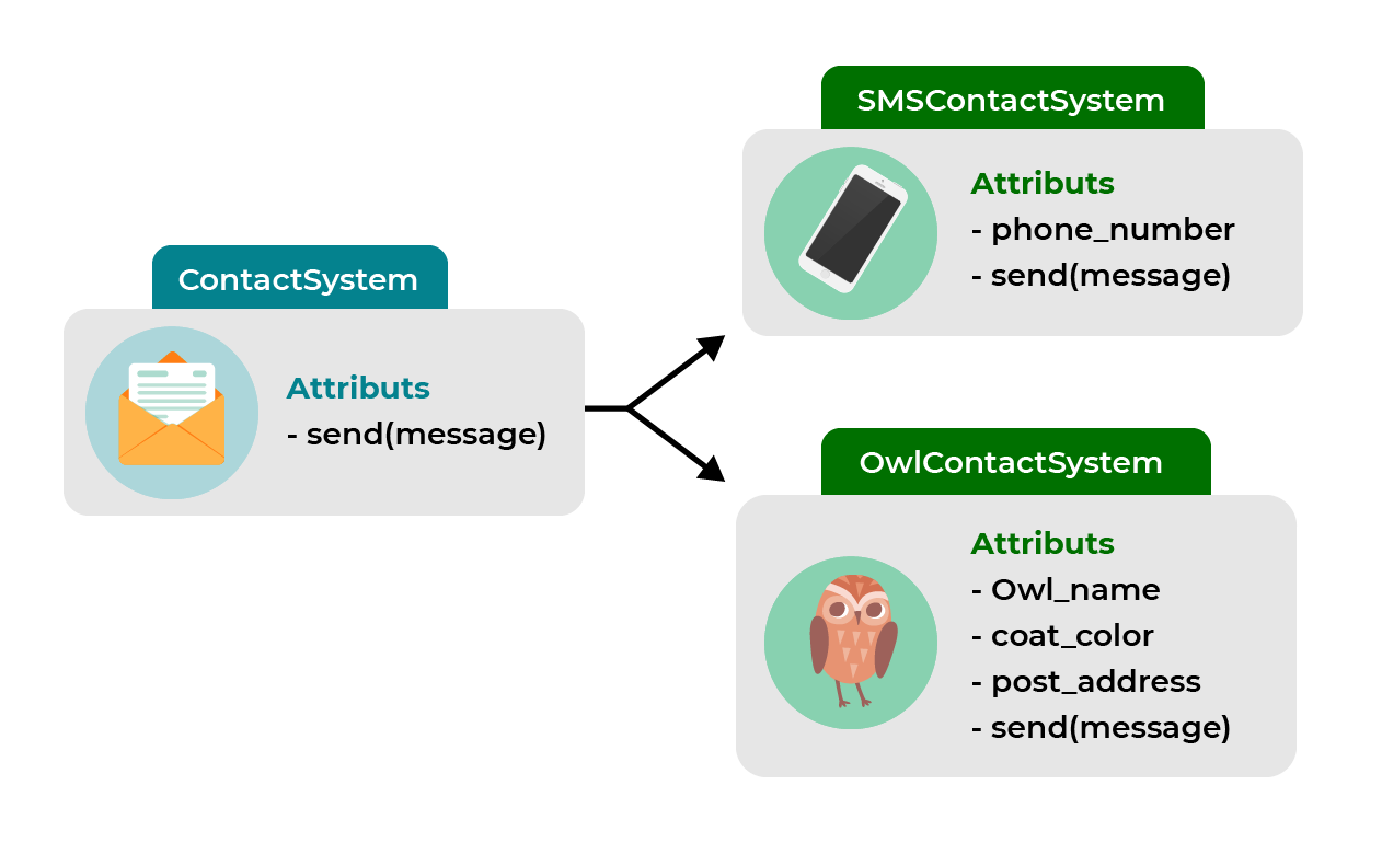 Chaque enfant implémente sa propre méthode send(message), qui se comporte différemment – elle envoie un SMS, un e-mail, ou un document à l’imprimante.