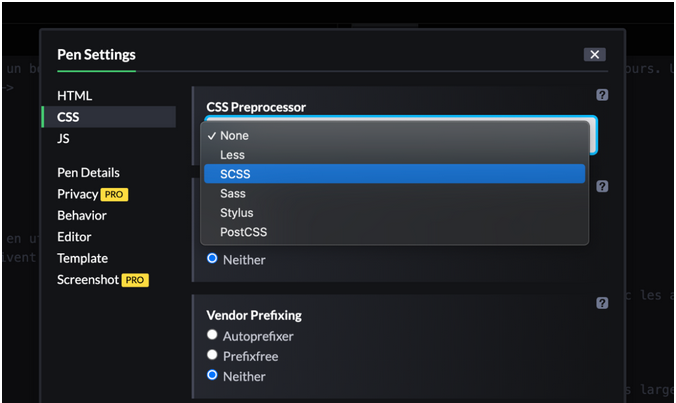 Définir SCSS ou Sass comme préprocesseur sur Codepen