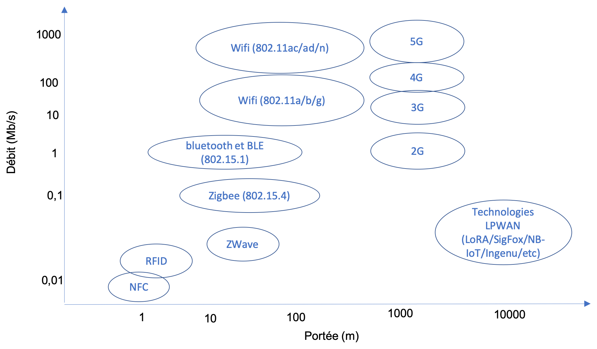 Chaque technologie de communication radio se caractérise principalement par sa portée et son débit. Ces derniers sont généralement liés aux bandes de fréquences qu'elles utilisent. Plus les fréquences sont hautes, plus la portée est courte mais plus le débit est élevé. Également, plus la portée est grande ou plus le débit est élevé, plus la consommation énergétique est grande. La figure ci-dessous positionne les technologies radio les plus connues en fonction de ces caractéristiques.