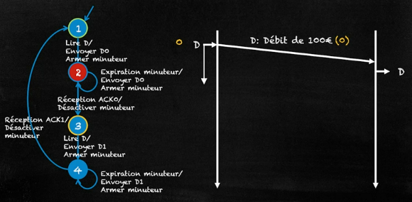 Comme on le voit sur notre schéma, dans l’état initial 1, l’entité attend des données de la couche supérieure. Lorsqu’elle en reçoit au travers l’évènement « Lire D », elle envoie D0 au récepteur, arme le minuteur et passe dans l’état 2.