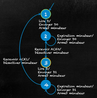 De manière similaire l’état 4 est semblable à l’état 2 et permet lors de la réception de ACK 1 de revenir à l’état 1.