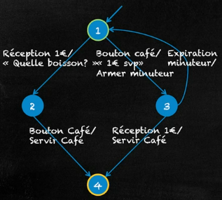 A chaque transition est associé un évènement: réception d’une pièce d’un euro, expiration d’un minuteur, appui sur une touche de la machine pour choisir une boisson, etc.