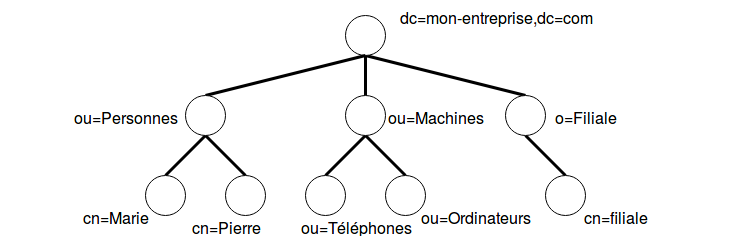 Une recherche dans cet annuaire à partir du nœud “ou=Machines,dc=mon-entreprise,dc=com” et avec l’étendue (scope en anglais) “base” ne prendra pas en compte les attributs de “ou=Téléphones,ou=Machines,dc=mon-entreprise,dc=com”.
