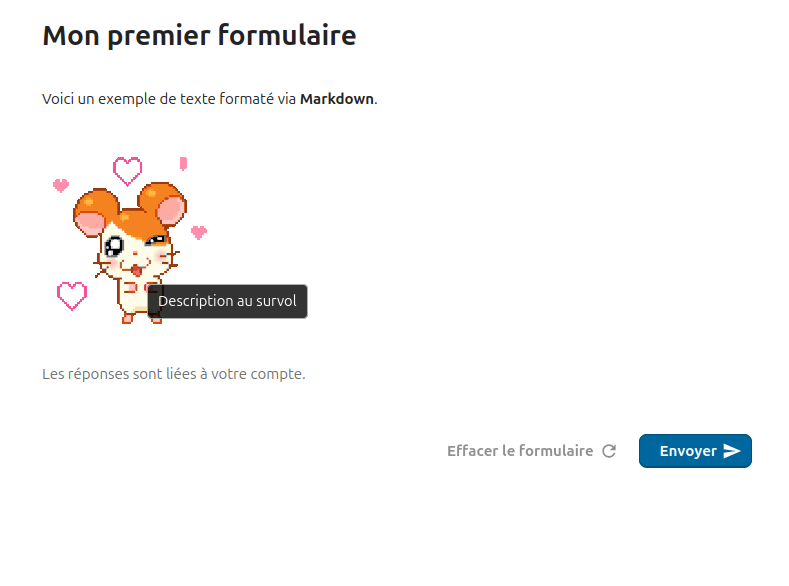 Pour ajouter des images aux formulaires ou aux sondages, on utilise la syntaxe Markdown mais il faut traduire l'URL du lien public généré via le frontend Nextcloud en URL WebDAV :